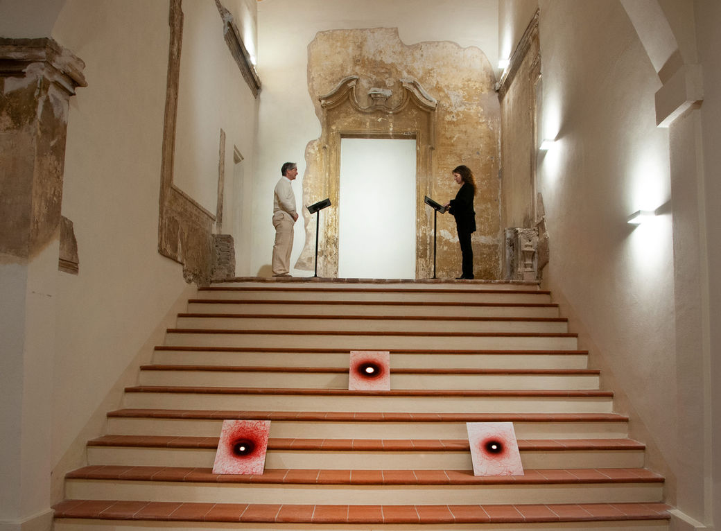 (...) During the Open studio, the ascending-descending verses of his Confessions from Acclivitas are recited at the top of the staircase of Villa Davia by Gabriele Duma and Antonella Franceschini of Opificio d'Arte Scenica. In dialogue with Palmi's Intus-Extra, photographs of Sensitive Lambs drawn in swirling sanguine and rolled up, the duo guide the observer's gaze into the gut in the paper, through the carcass-tunnel of the sacred animal in the direction of the luminous - quoting the artist - "Life after Life". (...)